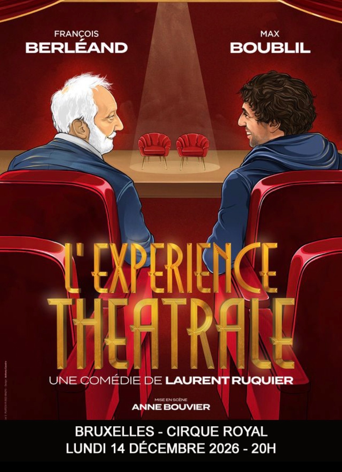 Cette pièce met en scène 2 acteurs de générations différentes, François Berléand et Max Boublil, pour rire avant tout et pour rendre hommage au théâtre, aux acteurs comme au public. Qui observe qui ? Que se passe-t-il sur scène ? Dans les coulisses ? Dans la salle ? Des superstitions, des règles, des rivalités, des anecdotes, des petits secrets… seront révélés et seront surtout des prétextes pour s’en amuser tous ensemble ! Cette expérience théâtrale devient un vrai moment de bonheur signé Laurent Ruquier.