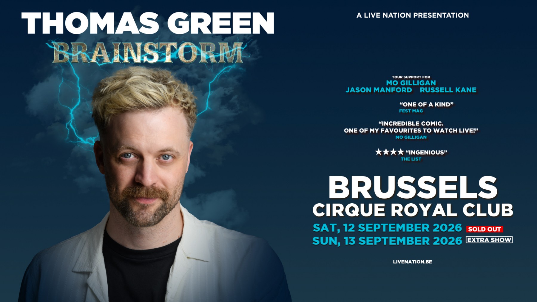 Après une belle série de shows complets en un temps record en 2025, Thomas Green poursuit sur sa lancée en 2026 avec une aisance déconcertante. Son spectacle annoncé au Cirque Royal Club de Bruxelles le 12 septembre prochain a affiché complet en un éclair ! Bonne nouvelle pour ses nombreux fans, l’humoriste australien ajoute une date supplémentaire dans la même salle, le dimanche 13 septembre 2026 ! Avec son spectacle « Brainstorm », il aborde son évolution personnelle et entraîne son public dans un tourbillon de surprises, d’absurdité et de douce folie. Une expérience à vivre sans hésitation ! Les tickets seront disponibles à partir du vendredi 17 avril à 10h via livenation.be.